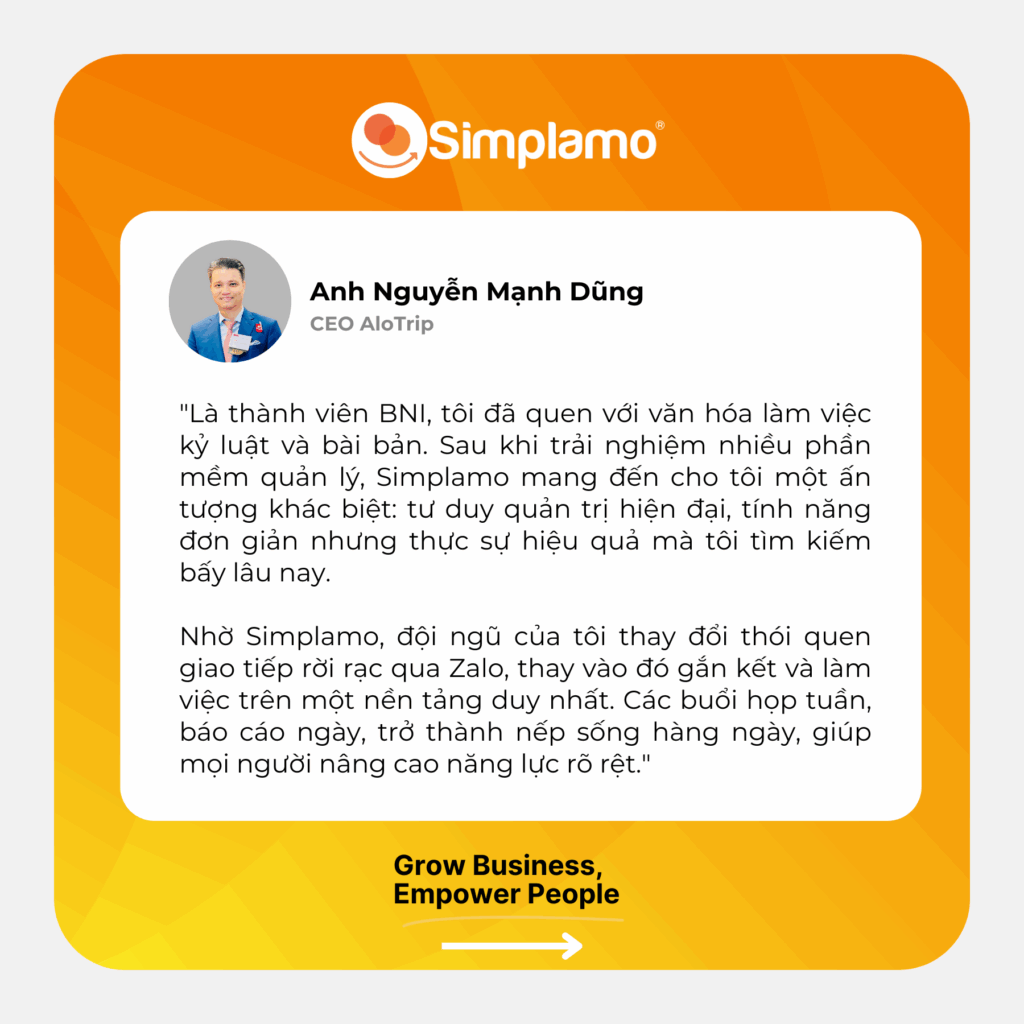 Là một thành viên tích cực của BNI Việt Nam, anh Dũng đặc biệt đề cao tính kỷ luật trong thực thi mục tiêu và văn hóa họp hành theo khung mẫu. Đây cũng là điểm mấu chốt khiến anh quyết định áp dụng Simplamo ngay sau lần đầu tiếp xúc.