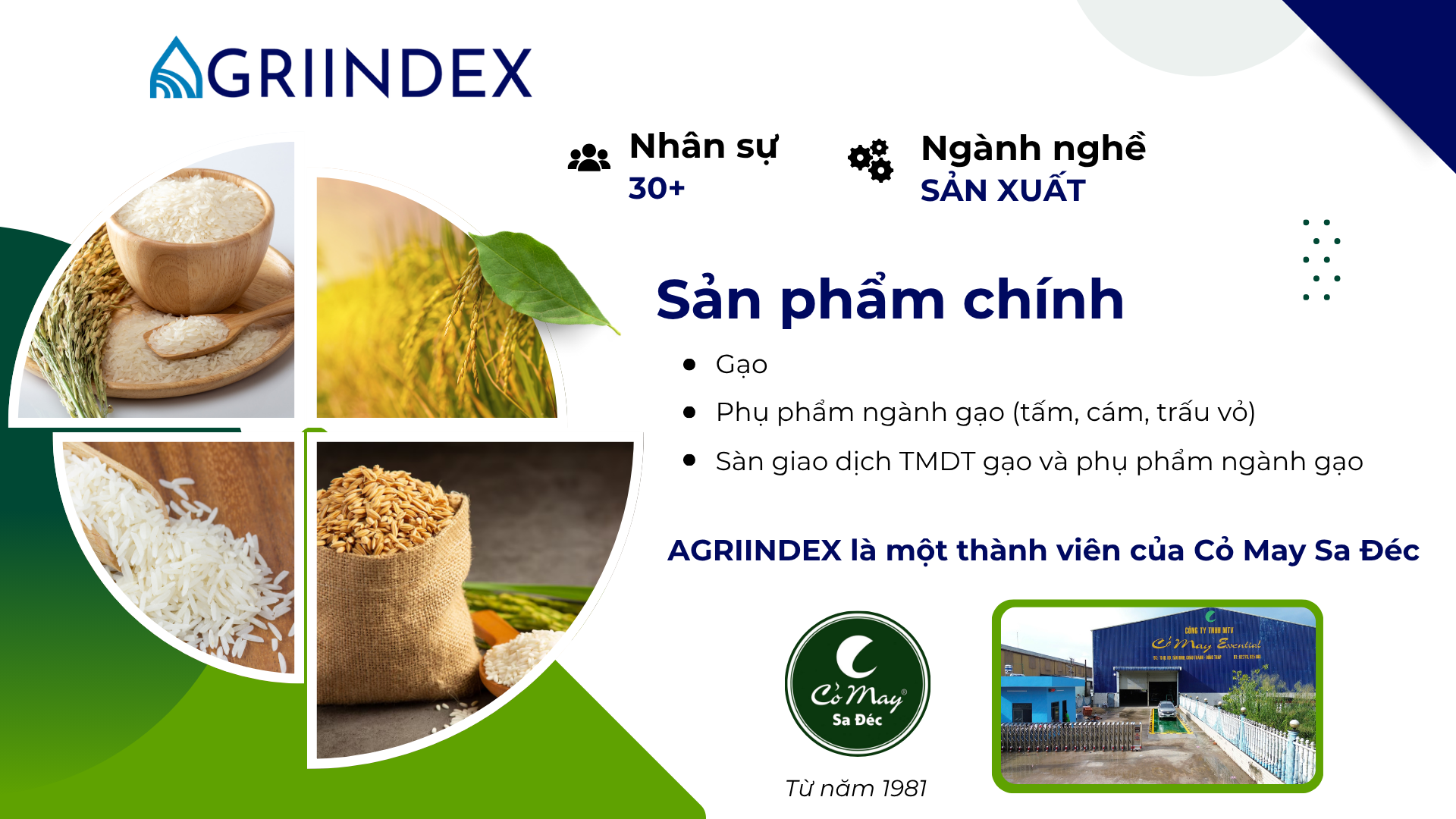 Là một thành viên trong hệ sinh thái Cỏ May Sa Đéc – Tập đoàn nông nghiệp với hơn 40 năm hình thành và phát triển, AgriIndex hoạt động trong lĩnh vực kinh doanh gạo và phụ phẩm ngành gạo như tấm, cám, trấu vỏ.